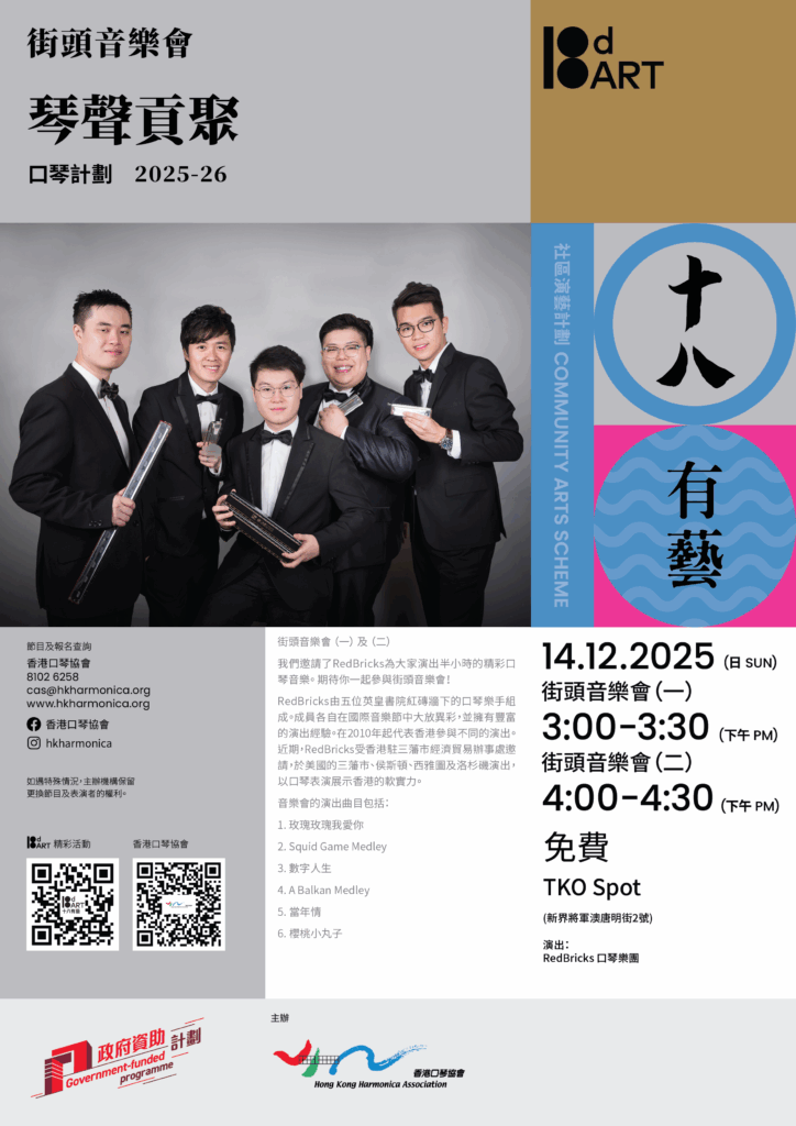 我們邀請了 RedBricks 為大家演出半小時的精彩口琴音樂。 期待你一起參與街頭音樂會!