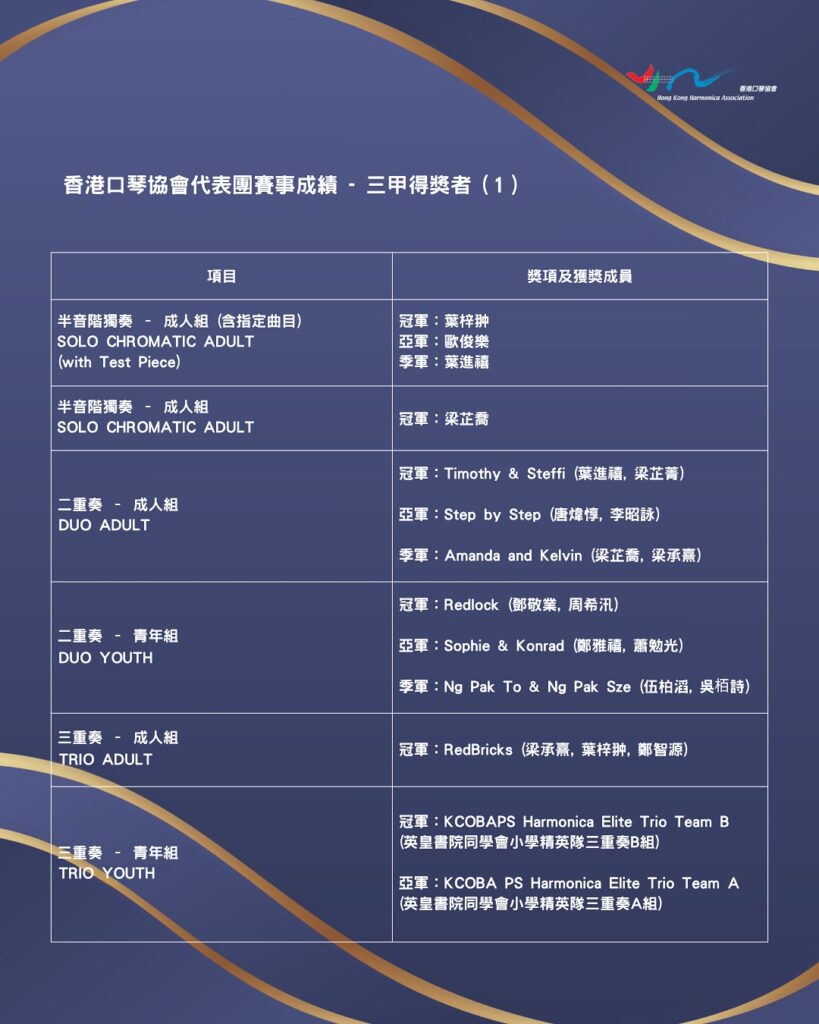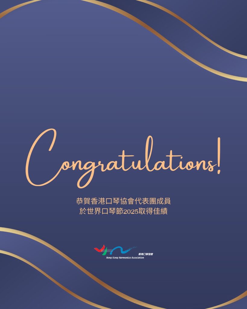 世界級比賽盛事、有「口琴界奧林匹克」美譽的第十屆的世界口琴節 2025 (World Harmonica Festival 2025) 已於當地時間 2025 年 11 月 1 日 (周六) 在德國特羅辛根 (Trossingen)圓滿結束,11 月 2 日 (周日) 於 Dr Ernst Hohner Concerthall 公佈結果。香港口琴協會(協會)代表團合共參與了 14 項賽事,在 10 個項目奪得 18 個三甲獎項,其中勇奪 9 個 冠軍殊榮。
