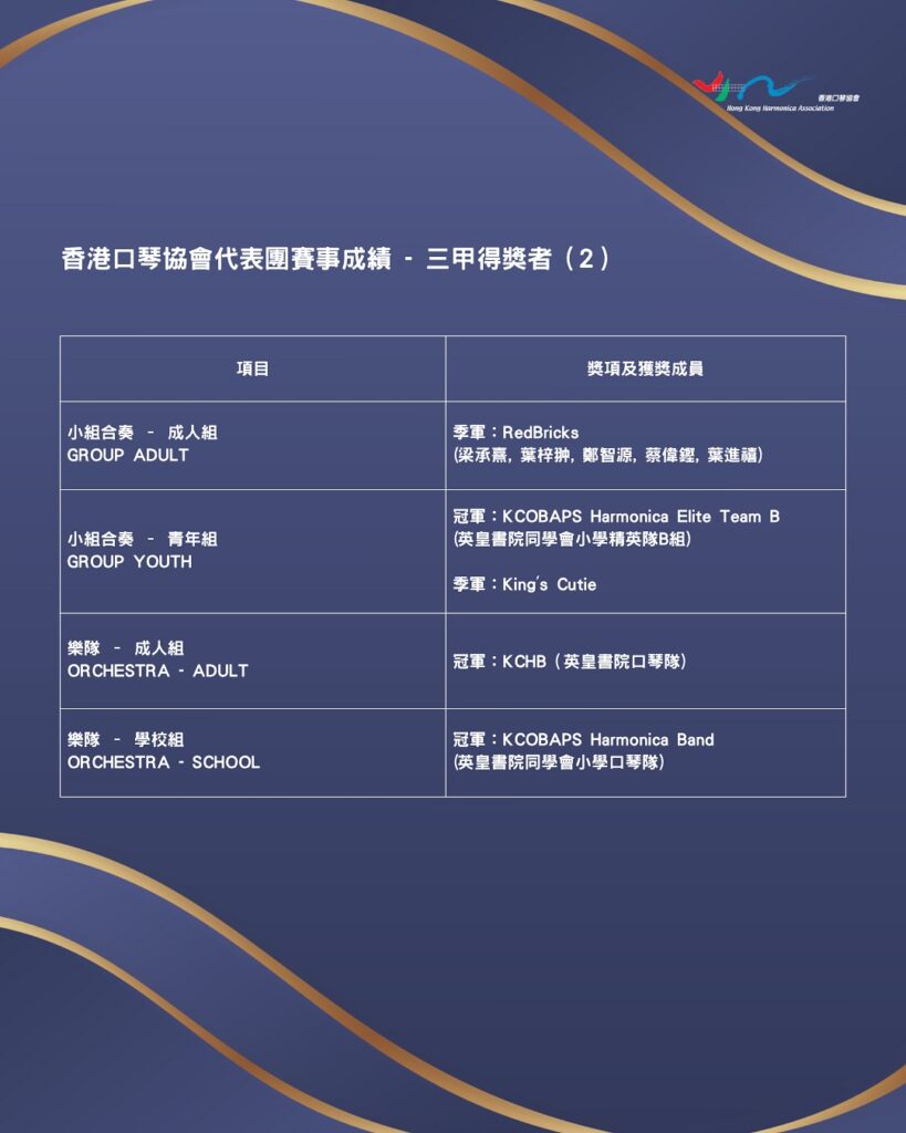 協會今年組織了超過 150 人的代表團參與世界口琴節,參與人數為歷屆最多。出戰賽事的口琴手於當地時間 10 月 30 日起至 11 月 1 日,在一連三日的賽事中與全球數百位頂尖好手同場較量。協會代表團在以往的世界口琴節賽中事屢創佳績,在 2017 年的世界口琴節便奪得 6 冠、6 亞、8 季共 20 個三甲獎項。今年協會代表團再次大放異彩,在一眾世界級參賽者中 脫穎而出。在總共 16 項賽事中,代表團共參與了 14 項賽事,並在 10 個項目中奪得 18 個三甲獎項,其中包括 9 個冠軍殊榮 (詳情見下方附圖)。其中英皇書院同學會小學的口琴隊成員,成為今屆比賽大贏家,分別在 6 項比賽中奪 3 冠 2 亞 1 季,合共取得 6 個三甲獎項。成員已多次在其他國際性的口琴比賽中奪獎。英皇書院口琴隊亦在樂隊成人組別勇奪冠軍。
